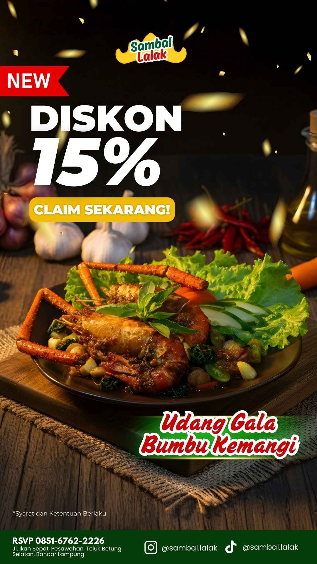 Diskon 15% khusus untuk kamu yang cobain menu baru Udang Gala Bumbu Kemangi di Sambal Lalak.