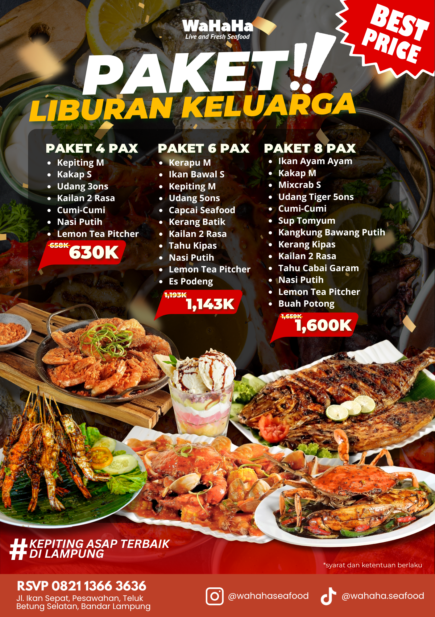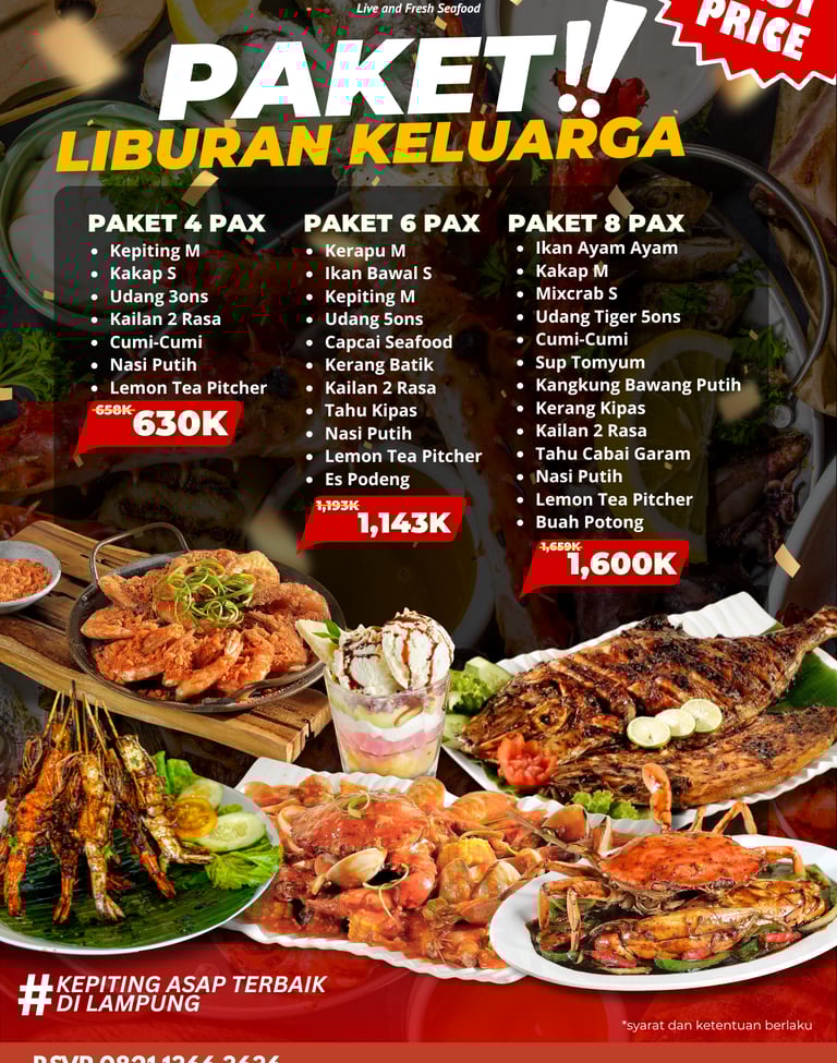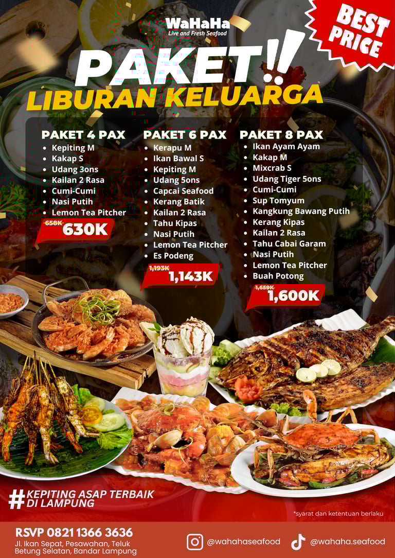 Mau liburan atau lagi liburan di Lampung wajib banget buat cobain paket liburan di WaHaHa Seafood. Harga paketnya yang pas dan seafood yang sudah pasti fresh, alhasil bikin moment liburan kamu makin happy!