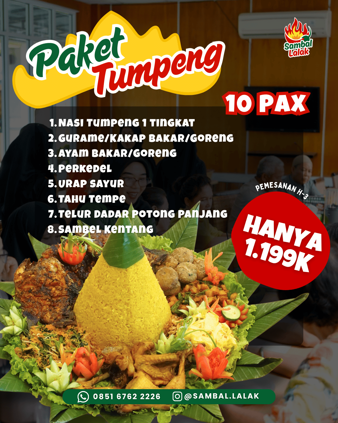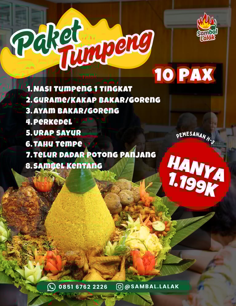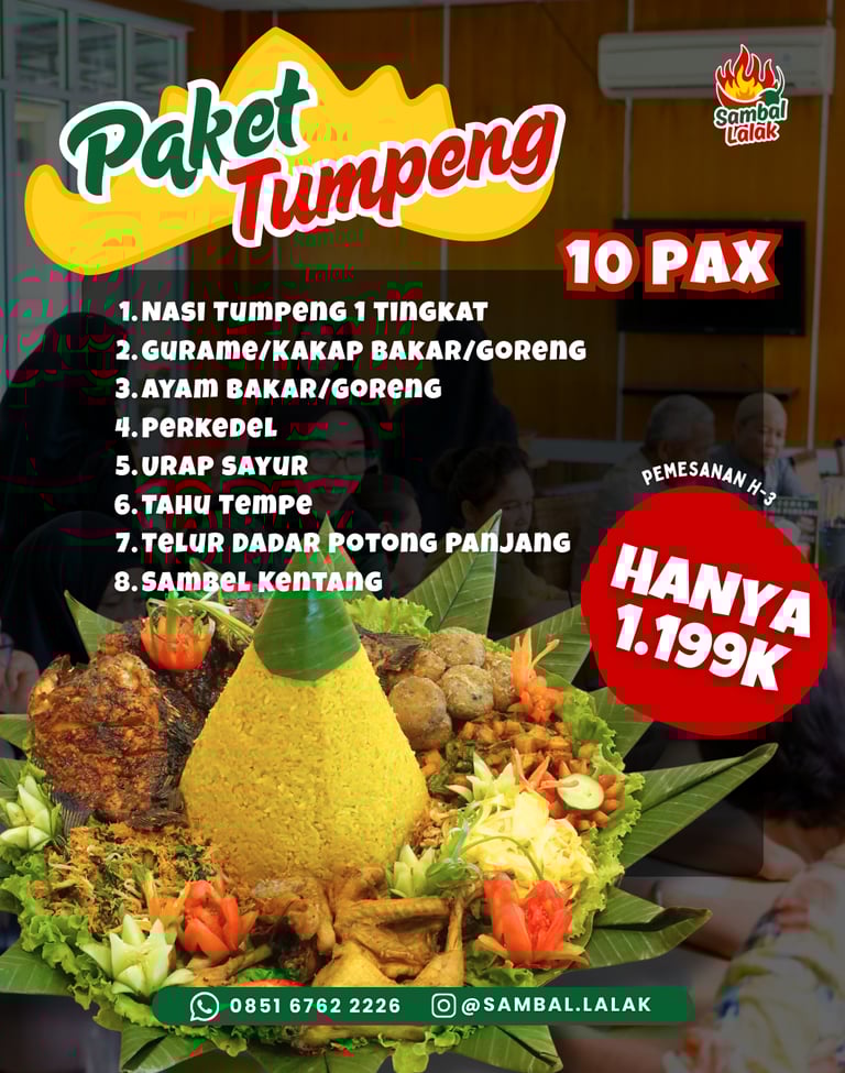 Mau makan rame-rame atau mau rayakan moment spesial? Sekarang tidak perlu bingung, karena ada paket tumpeng sambal lalak! Paket ini bisa untuk 10 orang!