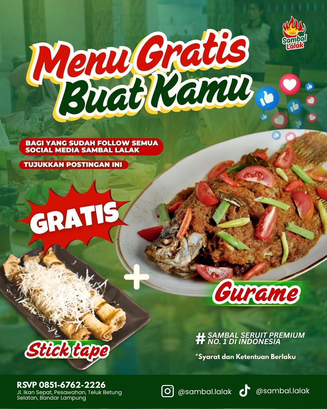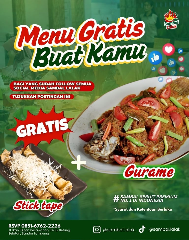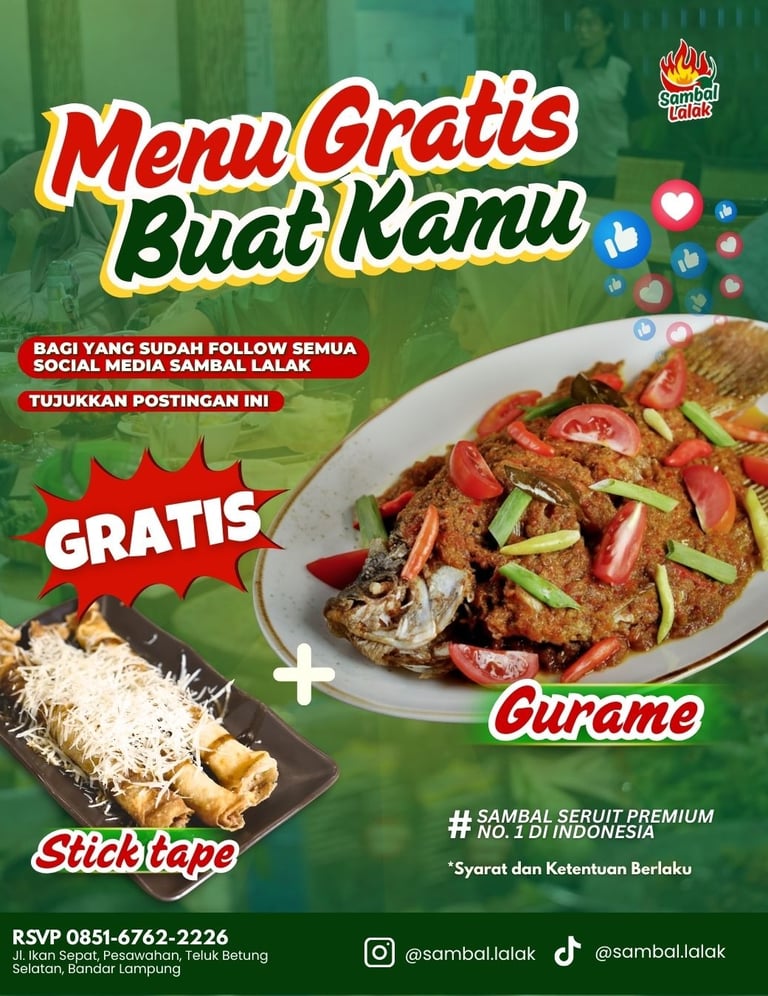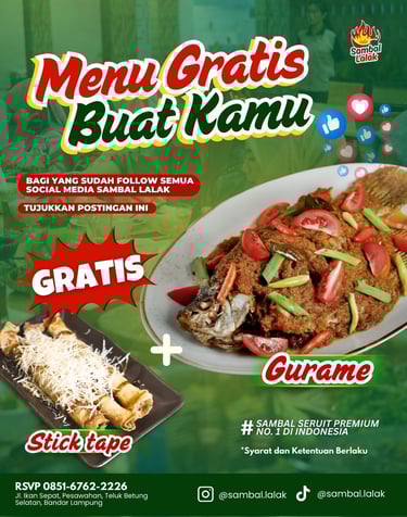 Hanya dengan follow sosial media Sambal Lalak kamu udah bisa dapetin menu Gurame + Stick tape!